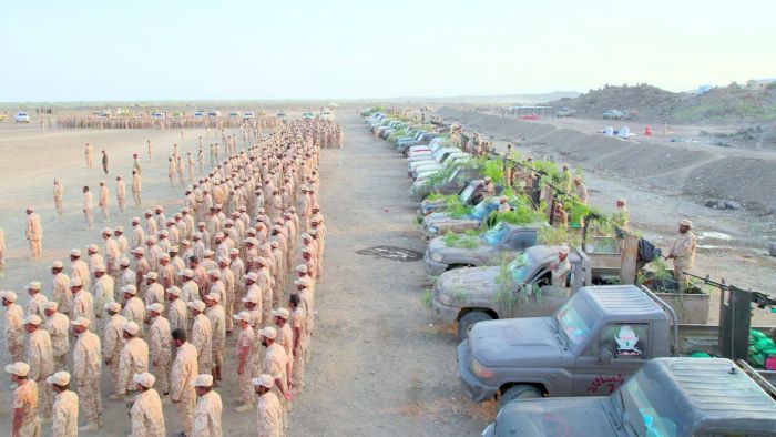 ونوه طارق صالح بالتضحيات التي يبذلها منتسبو المؤسسة العسكرية في مختلف الجبهات من حرض وميدي والحدود الشمالية مرورًا بالجوف ومأرب وشبوة والبيضاء والضالع وإب وتعز وصولًا إلى الساحل الغربي، قائلًا: "كل هؤلاء إخواننا يقاتلون معنا جنبًا إلى جنب، قضيتنا واحدة وهدفنا واحد: تحرير اليمن من مليشيات إيران".