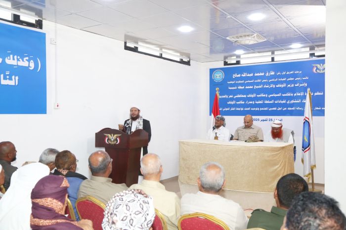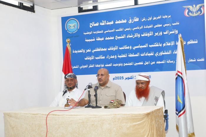 جاء ذلك في كلمة ألقاها خلال اللقاء التشاوري للسلطة المحلية ومكاتب الأوقاف بمحافظتي تعز والحديدة، الذي نظمته دائرة الإعلام والثقافة والإرشاد بالمكتب السياسي برعاية طارق صالح، وبإشراف وزير الأوقاف الدكتور محمد عيضة شبيبة، بحضور الدكتور عبدالله أبو حورية- الأمين العام المساعد للمكتب السياسي- ومدراء المديريات وممثلين عن مكاتب الأوقاف في المحافظتين.